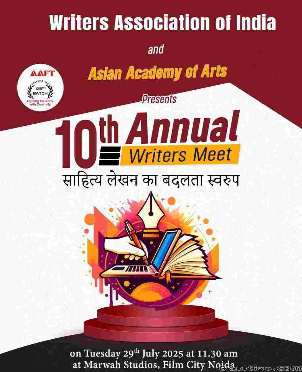 Noida, July 2025: The 10th Annual Meet of the Writers’ Association of India will take place at the iconic Marwah Studios, Film City Noida, bringing together a distinguished gathering of writers, authors, poets, and poetesses from across the nation. The event is being organized in association with the International Chamber of Media and Entertainment Industry (ICMEI), Asian Academy of Arts, and AAFT International Skill Development Council, reinforcing its national and global literary relevance.
