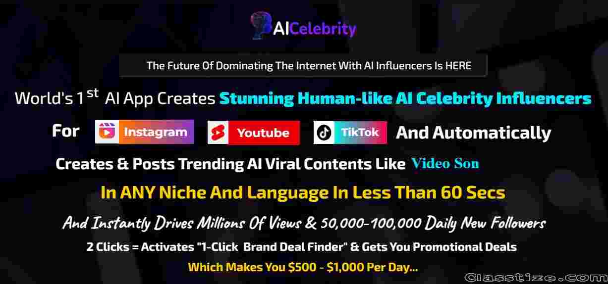 Create & Sell Unlimited AI Viral Celebrities Videos For Maximum Profits. World's First AI App Creates Ultra-Realistic AI Celebrity Videos In Less Than 60 Seconds! 2 Clicks = Make Your Favourite Celebrity Sing, Dance And Even Create Movies For You....& Publish Them On Instagram Youtube TikTok. And Instantly Drives Millions Of Views & 10,000-50,000 Daily New Followers. Activate "1-Click Celebrity Brand Deal Finder" & Get Promotional Deals. Which Makes You $500 - $1,000 Per Day...Create World-Class Viral AI Celebrity Videos. And Drive Massive Followings & BIG Brands DEALS. Discover The True Potential Of AI Celebrity Sneak Peek To The Limitless Possibilities. Dominate All The Trending Niches While Gaining Massive Followers, Views, Traffic & BIG Brand DEALS....