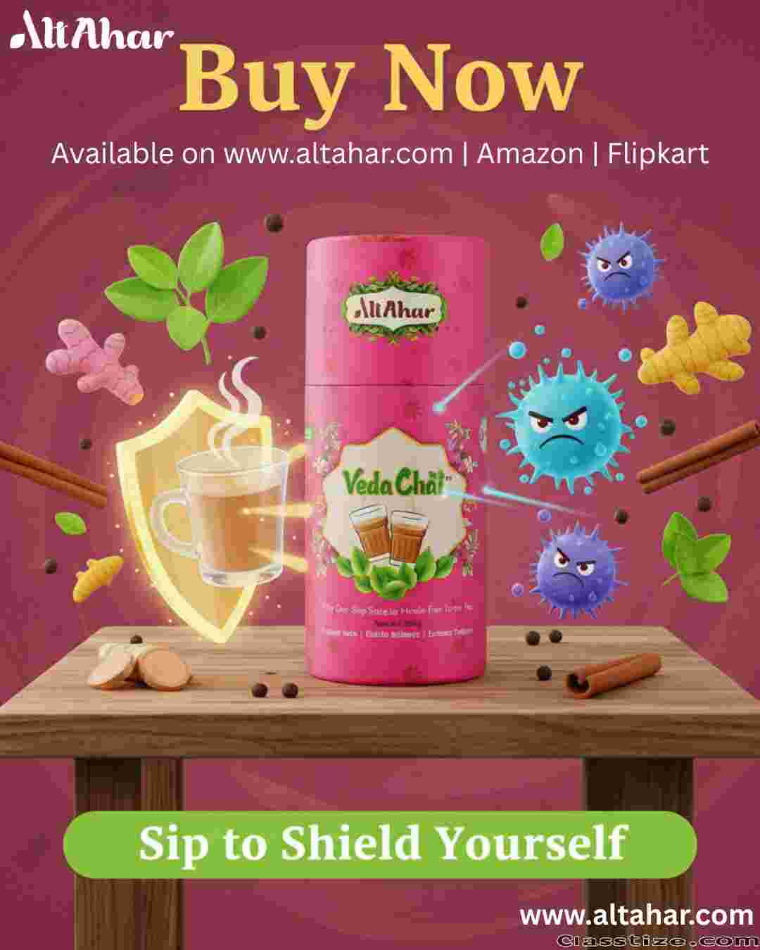 AltAhar Veda Chai is a traditional Ayurvedic immunity booster tea blended with herbs and spices to support immune strength, overall wellness, and daily health.