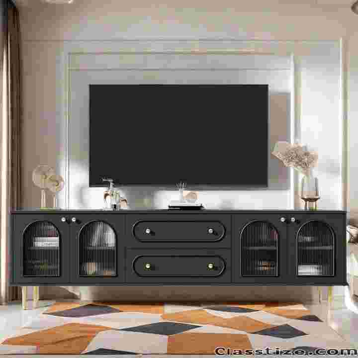 Its design features arched fluted glass doors, accented with golden knobs that bring a touch of timeless charm. Resting on sleek, sturdy metal legs, the stand ensures both stability and contemporary style. Inside, you’ll find generous storage with two spacious drawers and four shuttered compartments, perfect for organizing media devices, accessories, and living room essentials.