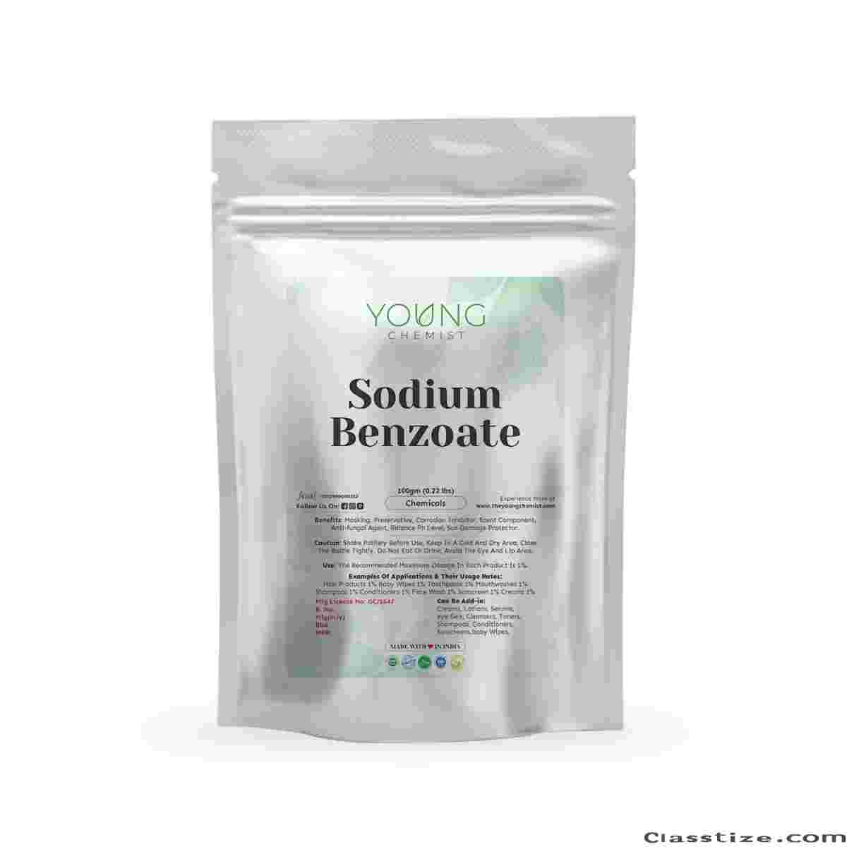 Young Chemist Sodium Benzoate is a common cosmetic chemical that offers several benefits in various personal care products. Here is a description of Sodium Benzoate, its benefits, how to use it, and some cautions to keep in mind: