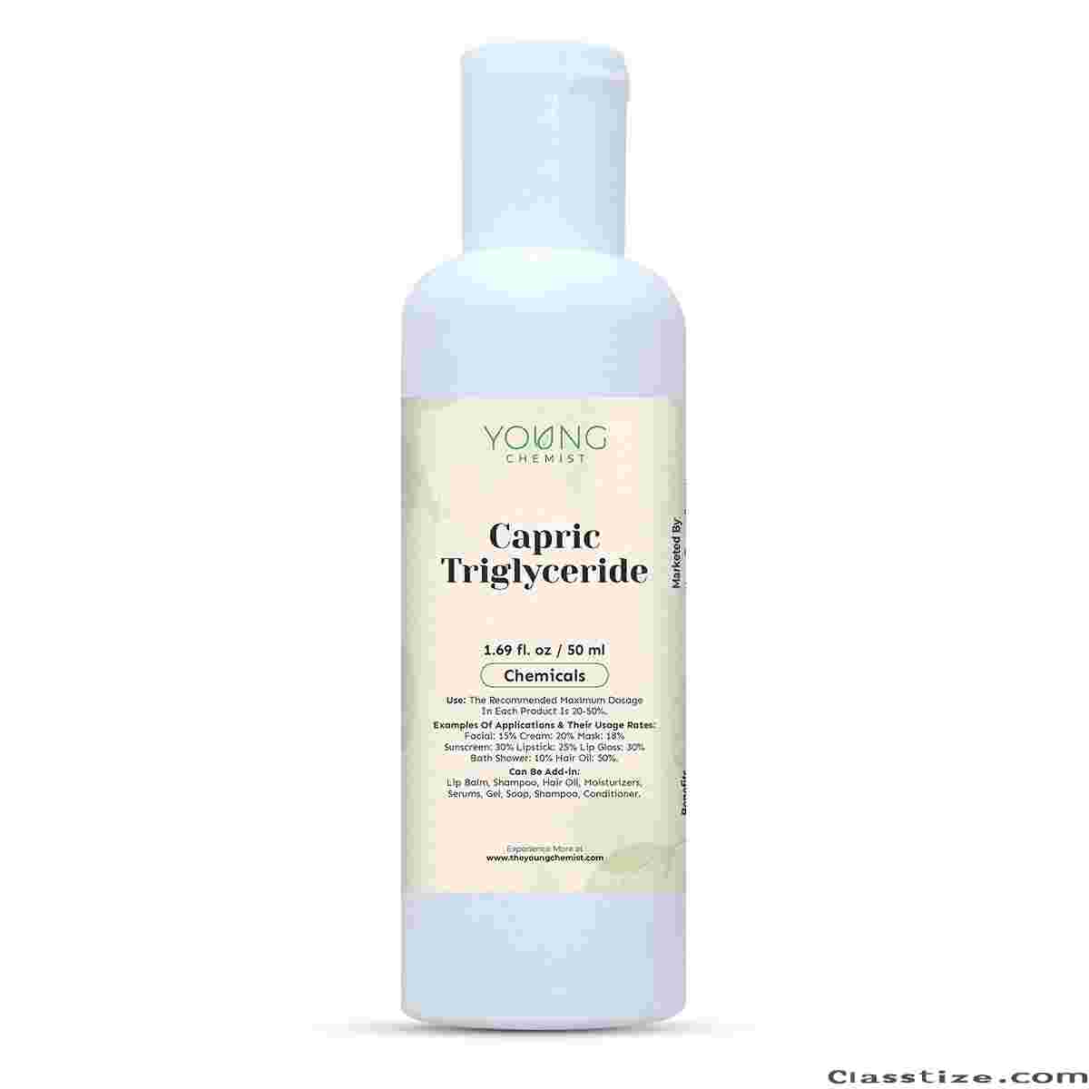 Young Chemist Capric Tri-Glyceride is a cosmetic chemical commonly used in skincare and personal care products. It is derived from coconut oil and consists of a mixture of capric acid and glycerin. This ingredient offers several benefits for the skin and is known for its emollient, moisturizing, and conditioning properties