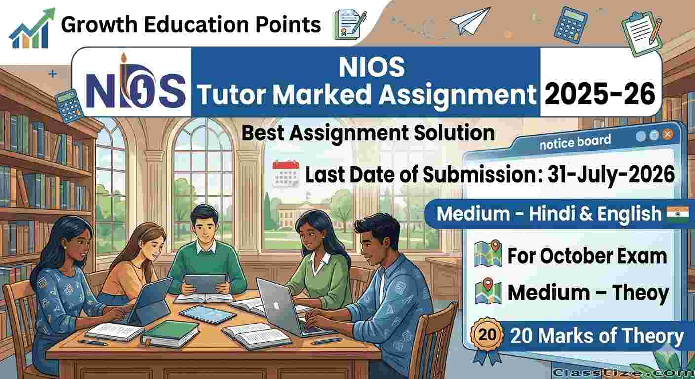 The Tutor Marked Assignment (TMA) for NIOS Class 12 is a mandatory internal assessment for Stream 1 students, accounting for 20% of the total theory marks in each subject. For the 2025–2026 session, assignments must be handwritten and uploaded as a single PDF via the official NIOS Student Portal. In the context of NIOS (National Institute of Open Schooling) Solved TMA, Growth Education Points is a prominent Indian educational resource provider that acts as a service for students who need assistance completing their mandatory Tutor Marked Assignments (TMAs). We provide solved assignments tailored to current NIOS board guidelines to help students secure high marks. Contact Us : 9582489391, 9716138286 or WhatsApp Visti My Website : https://www.growtheducationpoints.com/