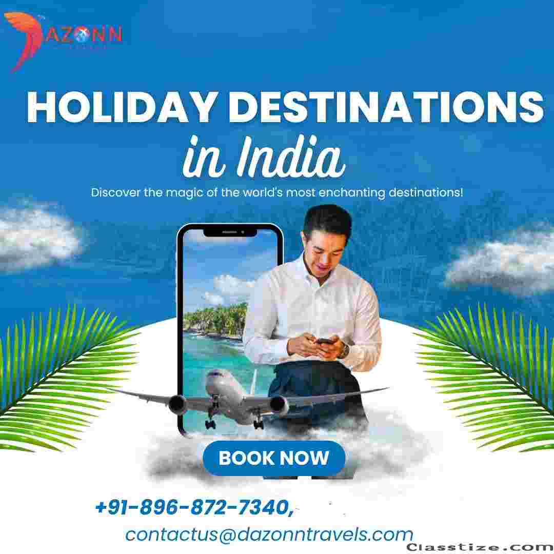 Explore the best holiday destinations in India with Dazonn Travels, your trusted travel partner for unforgettable experiences. We offer curated travel packages to serene beaches, lush hill stations, royal palaces, and spiritual getaways. Whether it's a family vacation, romantic escape, or adventure trip, our services ensure comfort, safety, and affordable pricing. From Kerala's backwaters to Kashmir's snow-capped beauty, Dazonn Travels delivers personalized itineraries, expert guidance, and 24/7 support. Make every holiday memorable with us—your journey begins with a perfect destination chosen with care and expertise. For more details visits our website or Contact us now: 896-872-7340