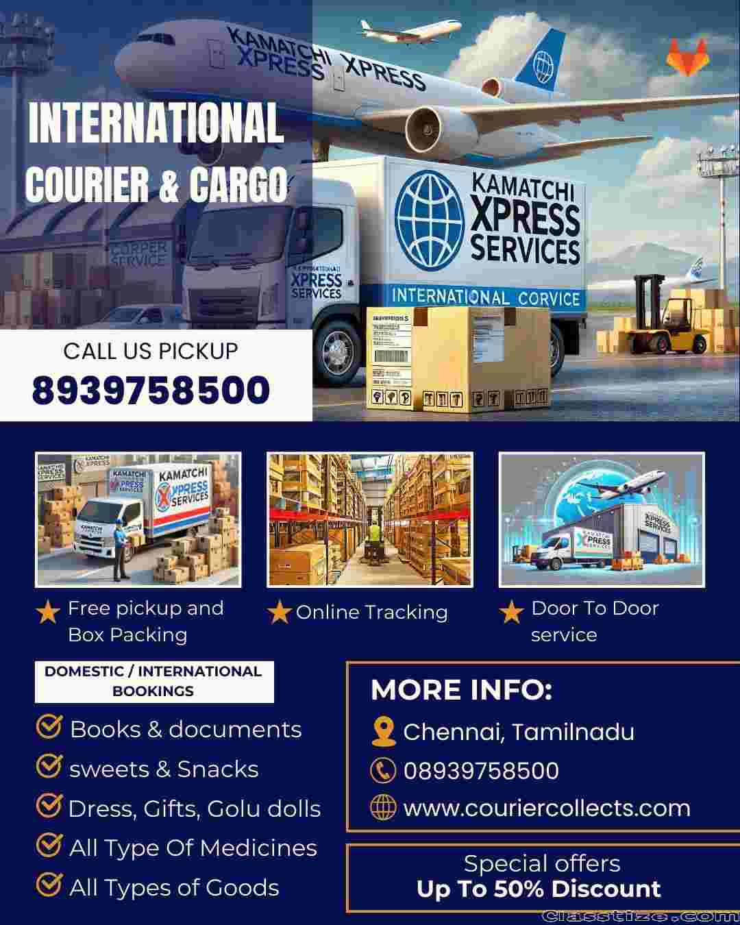 kamatchi xpress Specializes in international courier service 8939758500 with door-to-door pickup and delivery. They cater to over 200 countries, including the USA, UK, Canada, and world wide services. We send courier on Documents, Food items, Sweets, Snacks, Masala, Pickels, Dresses, Gift itmes, Artifical material, wooden material, golu dolls, Industrial goods and etc.