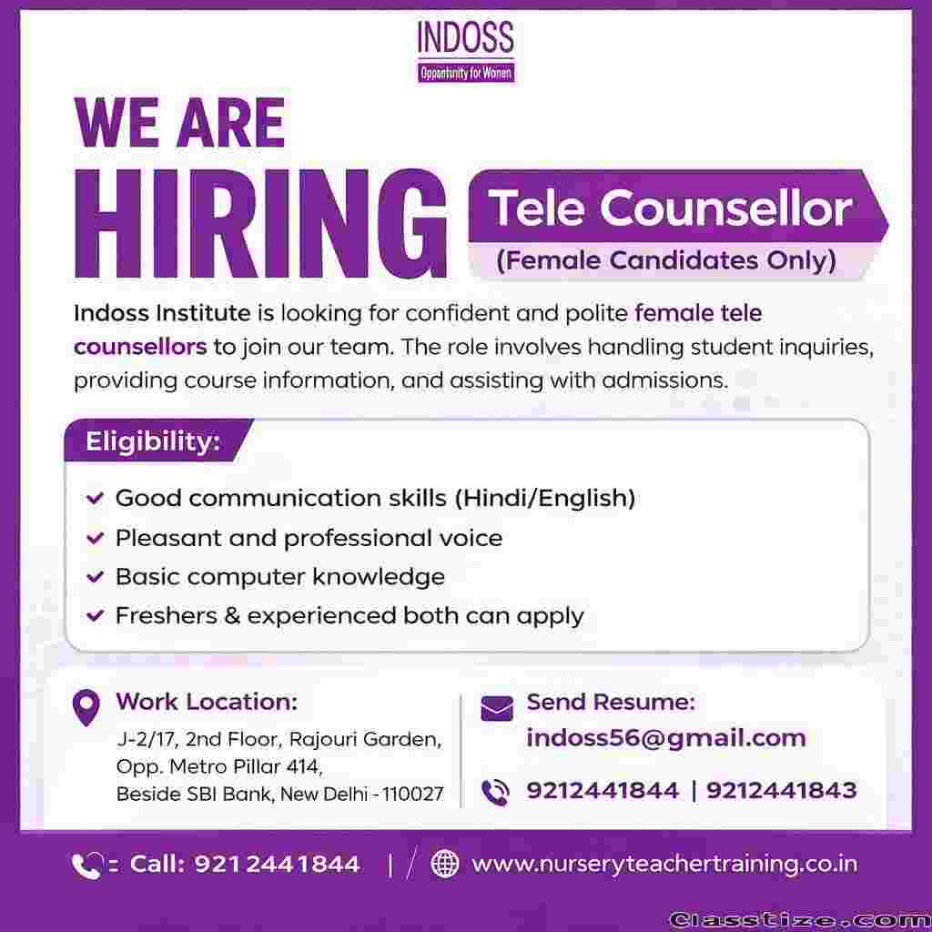 A reputed Teacher Training Institute is inviting applications for the position of Female Tele Counsellor. The role includes interacting with students over calls, explaining course details, and supporting the admission process.