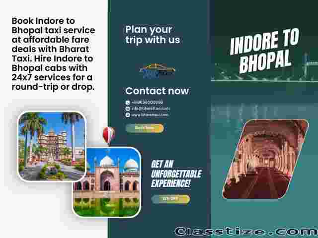 Book reliable Indore to Bhopal cabs with Bharat Taxi for a safe and comfortable ride. Choose from a range of cabs at affordable rates with 24/7 customer support. Enjoy easy booking, experienced drivers, and on-time service. Call +91-9696000999