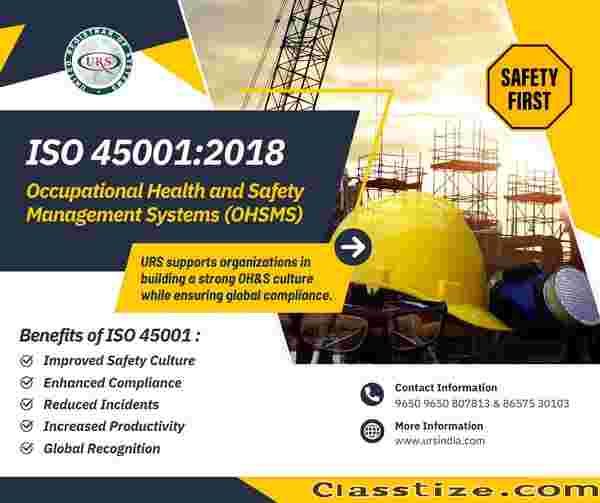 ISO 45001 Certification in Erode helps organisations establish a strong Occupational Health and Safety Management System to reduce workplace risks and improve safety performance. URS Certification provides audits, documentation guidance, and end-to-end support to achieve compliance, enhance employee well-being, meet legal requirements, and build a safer, more reliable work environment.