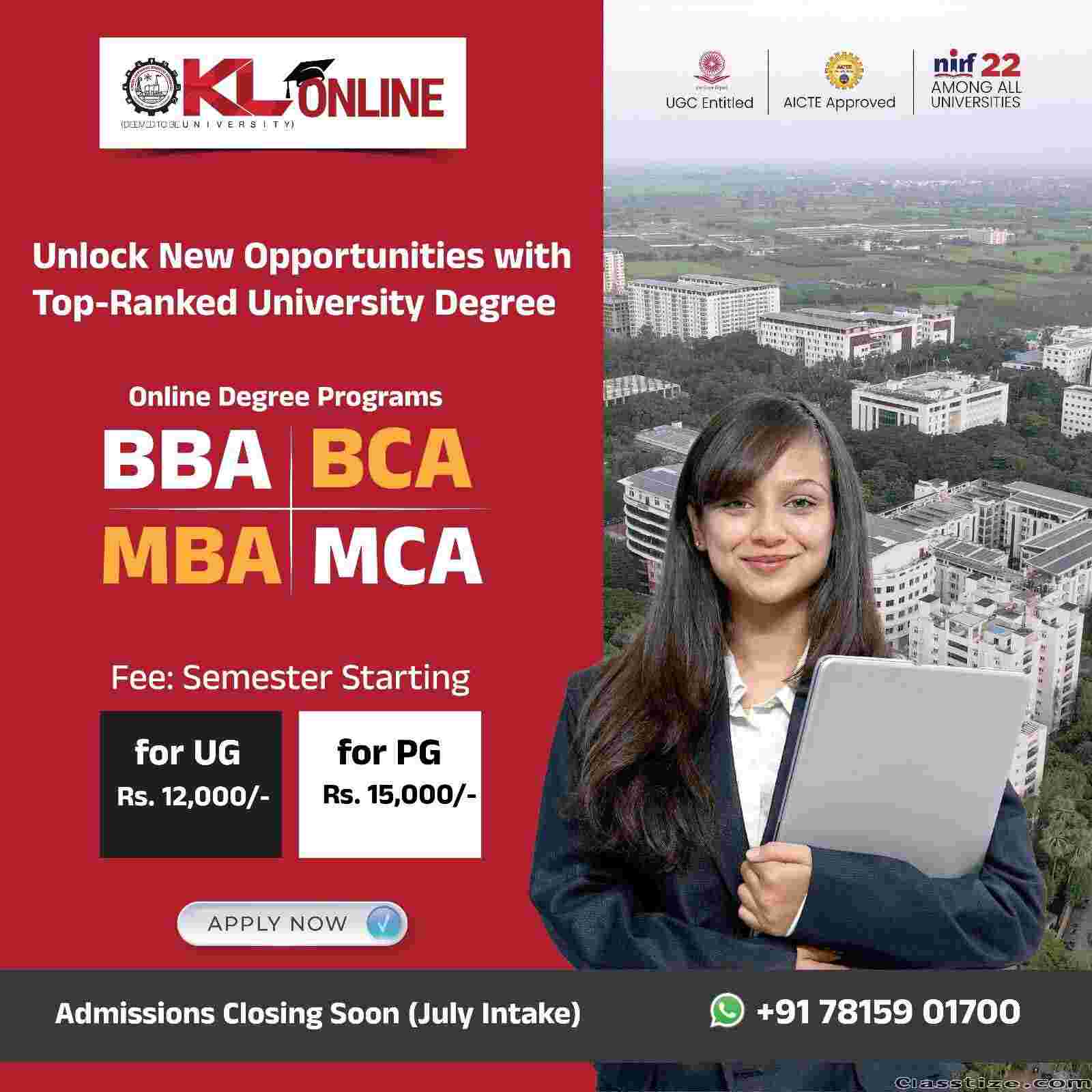 KL University online provides online degree in UG, PG Courses. Courses: , Online BBA, Online BCA,Online MBA, Online MCA.