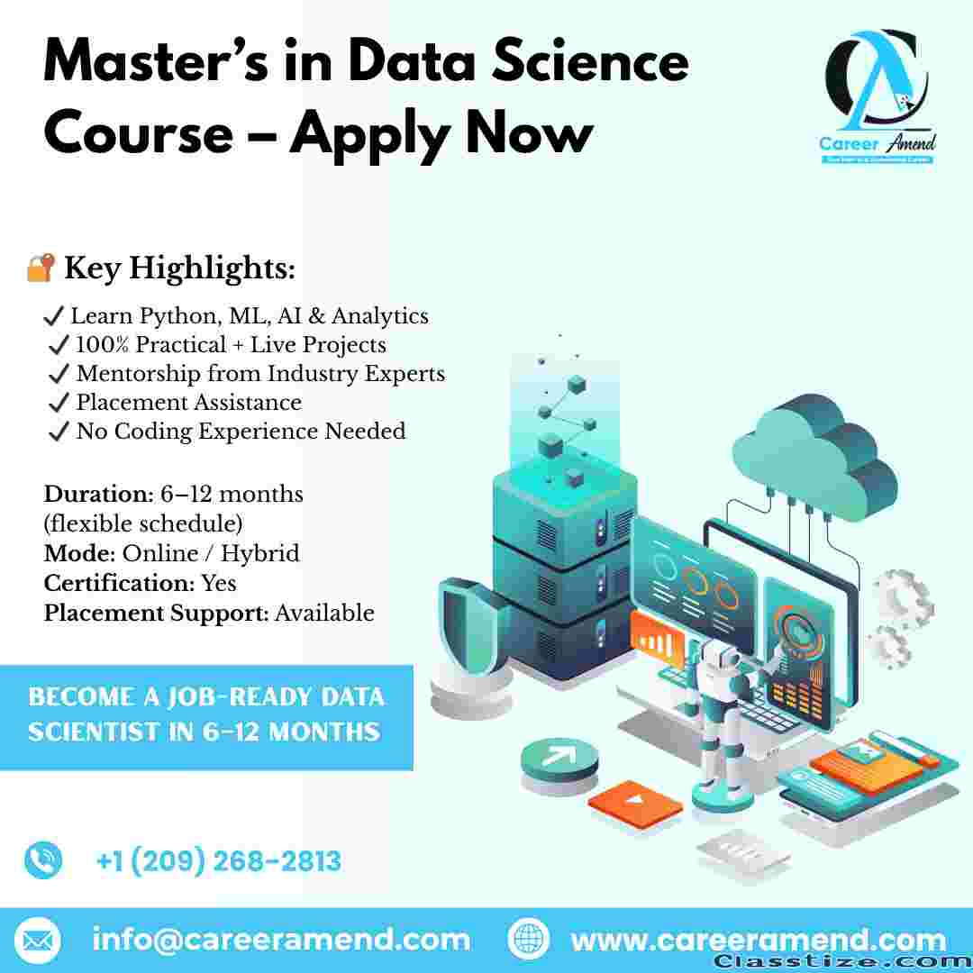 Kick-start a high-growth career with our Master’s in Data Science Course, designed for graduates and working professionals who want to excel in data-driven roles. This industry-focused program helps you build strong expertise in data analytics, machine learning, artificial intelligence, Python, SQL, and big data technologies.