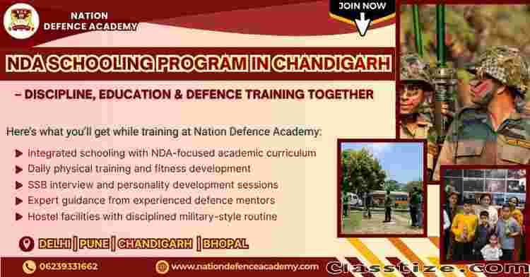 Looking for the best NDA coaching with schooling after 10th in Chandigarh? Nation Defence Academy offers top-tier integrated programs designed to prepare aspirants for NDA exams in 2026. Our courses combine comprehensive classroom training with school education, ensuring balanced academic growth and exam readiness. We provide a 2-year NDA Foundation Program, along with specialized coaching for 11th and 12th students, including physical training and personality development. Our institute in Chandigarh boasts experienced faculty, modern infrastructure, and personalized mentoring, helping students succeed in NDA written exams and SSB interviews. Enroll now for a successful defense career!
