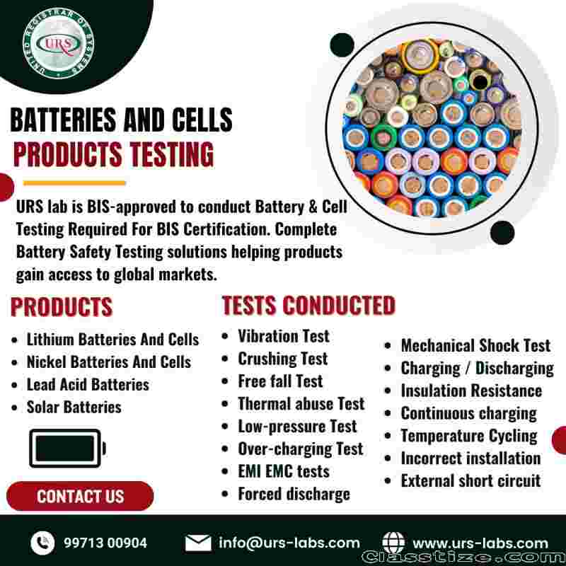 URS Nickel Batteries and Cells Testing Labs in Mumbai provide comprehensive testing services to evaluate the performance, safety, and durability of nickel-based batteries. Equipped with advanced instruments, these labs conduct electrical, thermal, and lifecycle tests, ensuring compliance with national and international standards while helping manufacturers deliver reliable and high-quality energy storage solutions.