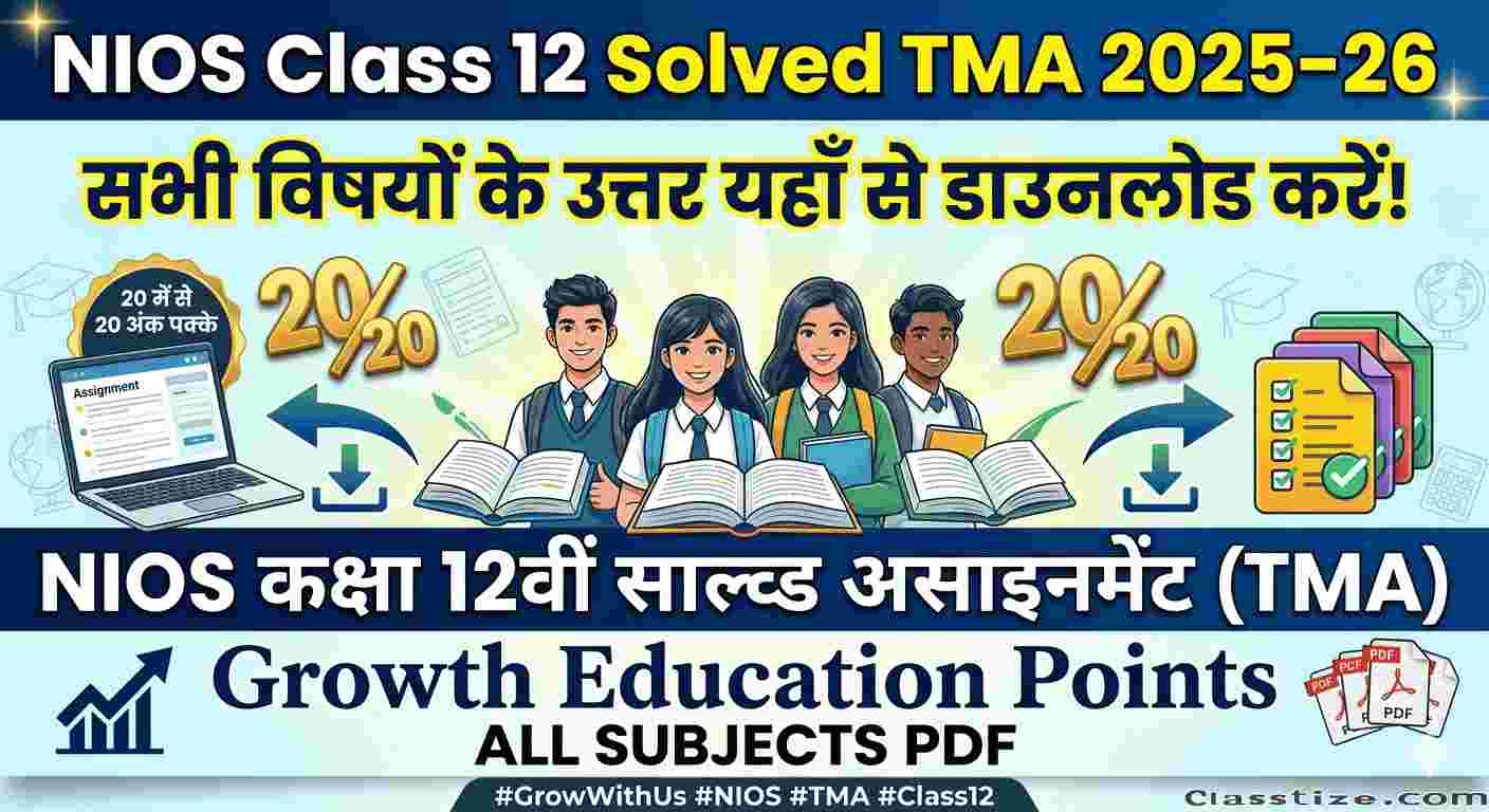 NIOS solved assignments (TMAs) for the 2025-26 session, crucial for Class 10 & 12 students, are available as downloadable PDFs from various educational platforms like NIOS official site for TMAs, Growth Education Points, offering solutions for all subjects in different mediums, often for a fee, to help students score well (20% of theory marks) and submit by deadlines. Get Nios Solved TMA for Secondary & Sr. Secondary Classes. Call@9582489391, 9716138286 or WhatsApp