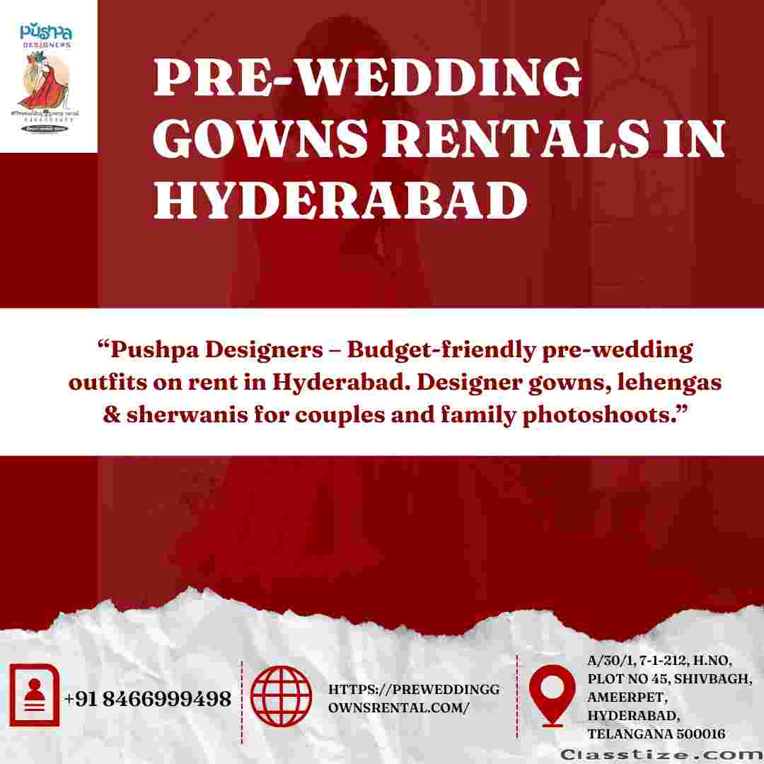 "Pushpa Designers offers stylish & affordable prewedding gown rentals in Hyderabad. Explore trail gowns, ball gowns, lehengas, sarees, sherwanis, blazers, maternity gowns & kids’ outfits for unforgettable photoshoots."