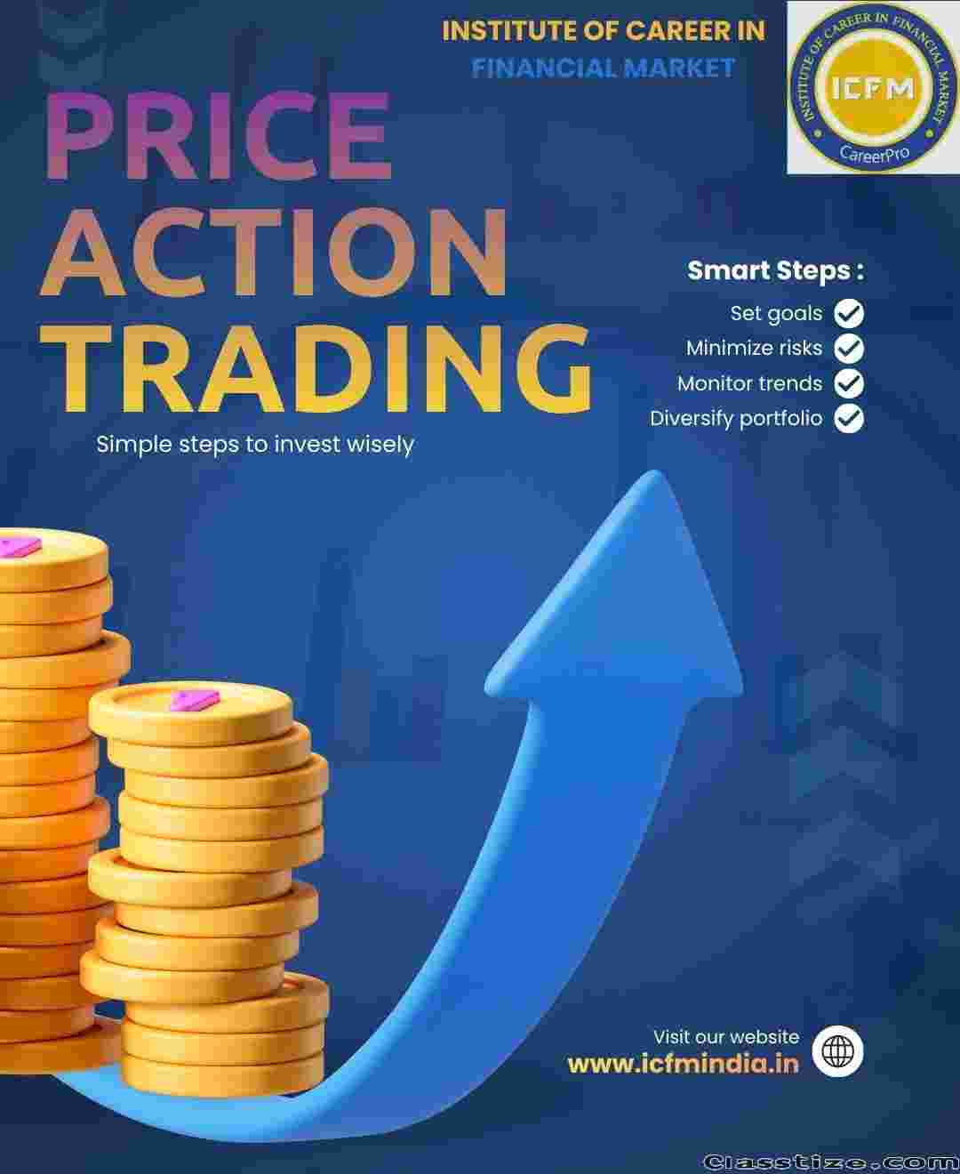 Beginners master price action at ICFM Delhi: candlestick basics (dojis, hammers), trends vs. ranges, S/R identification live NSE. Small groups clarify higher timeframe bias, pullback entries; no clutter. Risk via structure stops; recordings aid. Laxmi Nagar metro-easy; certs boost careers post-3 months.