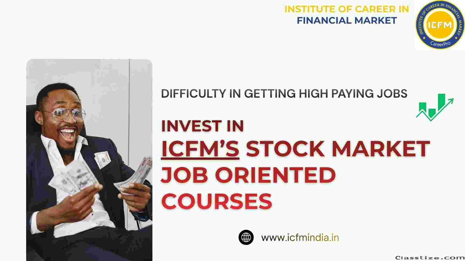 ICFM’s stock market job oriented courses cater to fresh graduates seeking finance careers and working professionals aiming for skill upgradation or career change. The program includes market basics, technical and fundamental analysis, derivatives, risk management, and trading psychology. Live trading labs and simulated scenarios provide experiential learning. The courses help develop professional skills needed for equities, derivatives, and research roles with certification and active placement services ensuring job readiness and career growth in the competitive Indian financial industry.