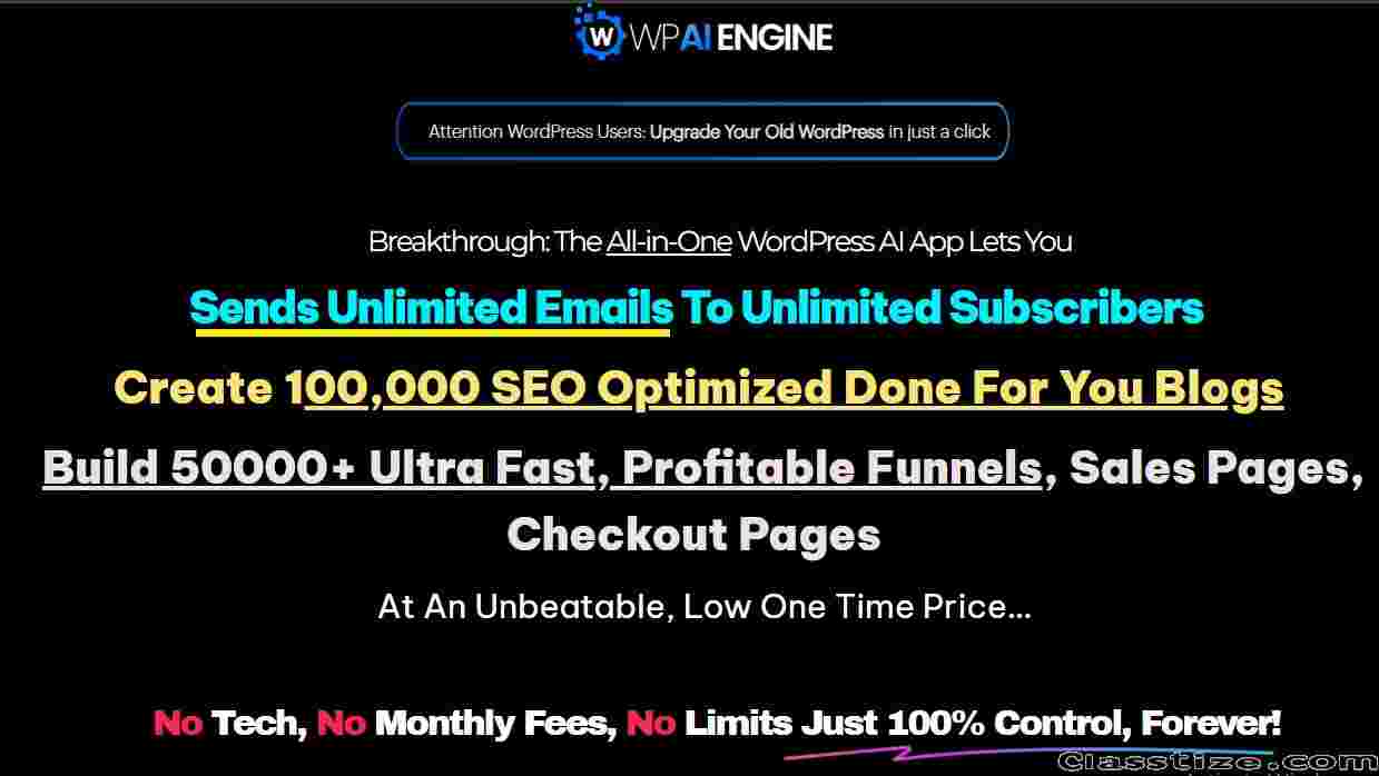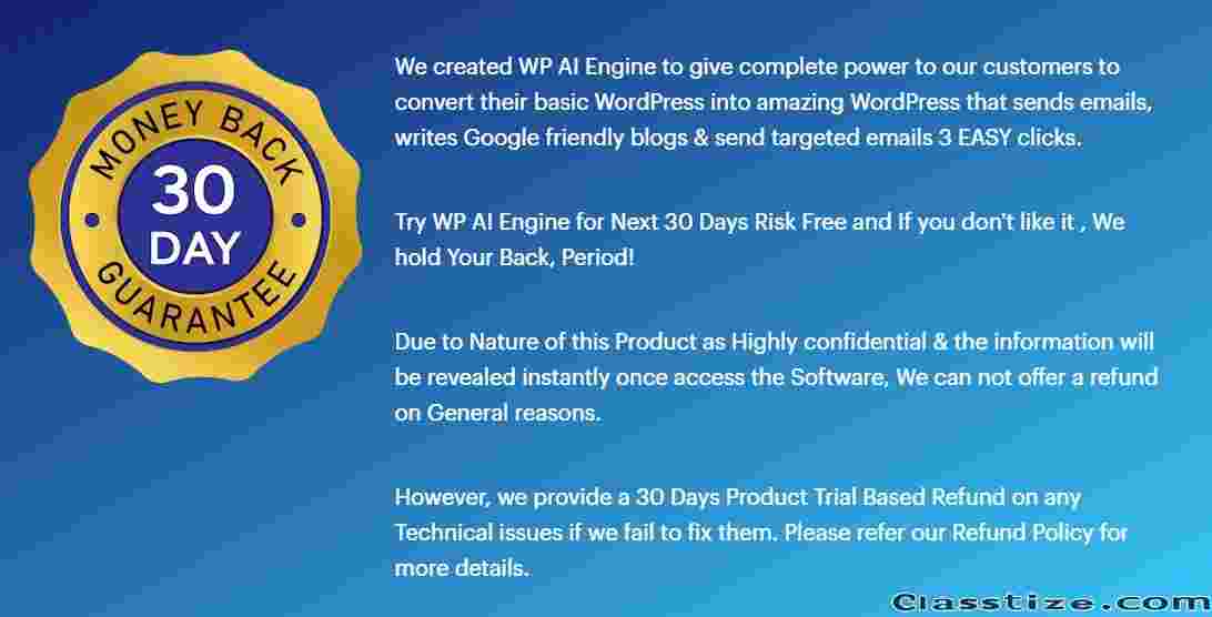 Attention WordPress Users: Upgrade Your Old WordPress in just a click. Breakthrough: The All-in-One WordPress AI App Lets You. Sends Unlimited Emails To Unlimited Subscribers. Create 100,000 SEO Optimized Done For You Blogs. Build 50000+ Ultra Fast, Profitable Funnels, Sales Pages, Checkout Pages. At An Unbeatable, Low One Time Price…No Tech, No Monthly Fees, No Limits Just 100% Control, Forever! We created WP AI Engine to give complete power to our customers to convert their basic WordPress into amazing WordPress that sends emails, writes Google friendly blogs & send targeted emails 3 EASY clicks. Try WP AI Engine for Next 30 Days Risk Free and If you don't like it , We hold Your Back, Period! Due to Nature of this Product as Highly confidential & the information will be revealed instantly once access the Software, We can not offer a refund on General reasons. However, we provide a 30 Days Product Trial Based Refund on any Technical issues if we fail to fix them. Please refer our Refund Policy for more details.